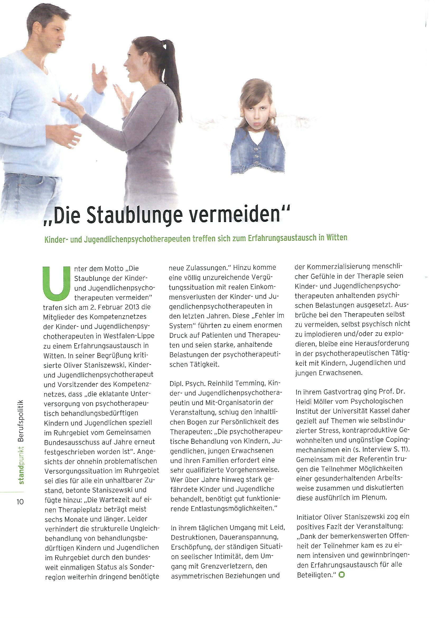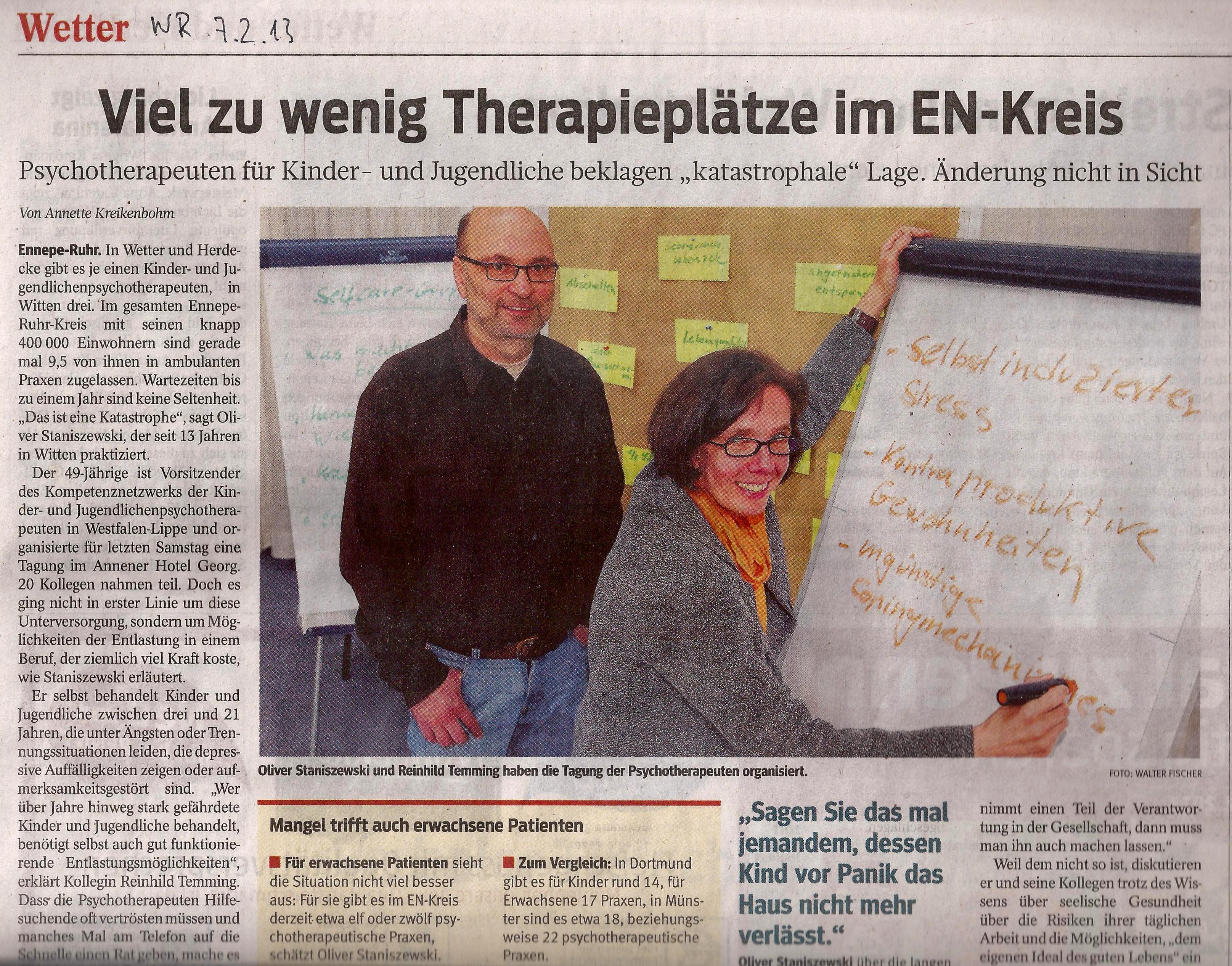 Unsere Arbeitsgruppe Öffentlichkeitsarbeit hat sich in der Vergangenheit unter anderem der Aufgabe gewidmet, auf die vor allem im Ruhrgebiet katastrophal mangelhafte Versorgung mit Psychotherapieplätzen für Kinder und Jugendliche und ihre Familien aufmerksam zu machen. Im Jahr 2012 wurde für fünf weitere Jahre festgeschrieben, dass es in der „Sonderregion Ruhr“ nur etwa ein Drittel an TherapeutInnen pro Kopf der Einwohner geben soll gegenüber anderen Großstädten. Im Jahr 2017 soll neu entschieden werden.